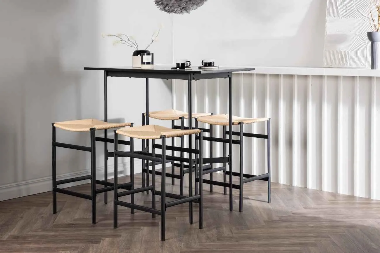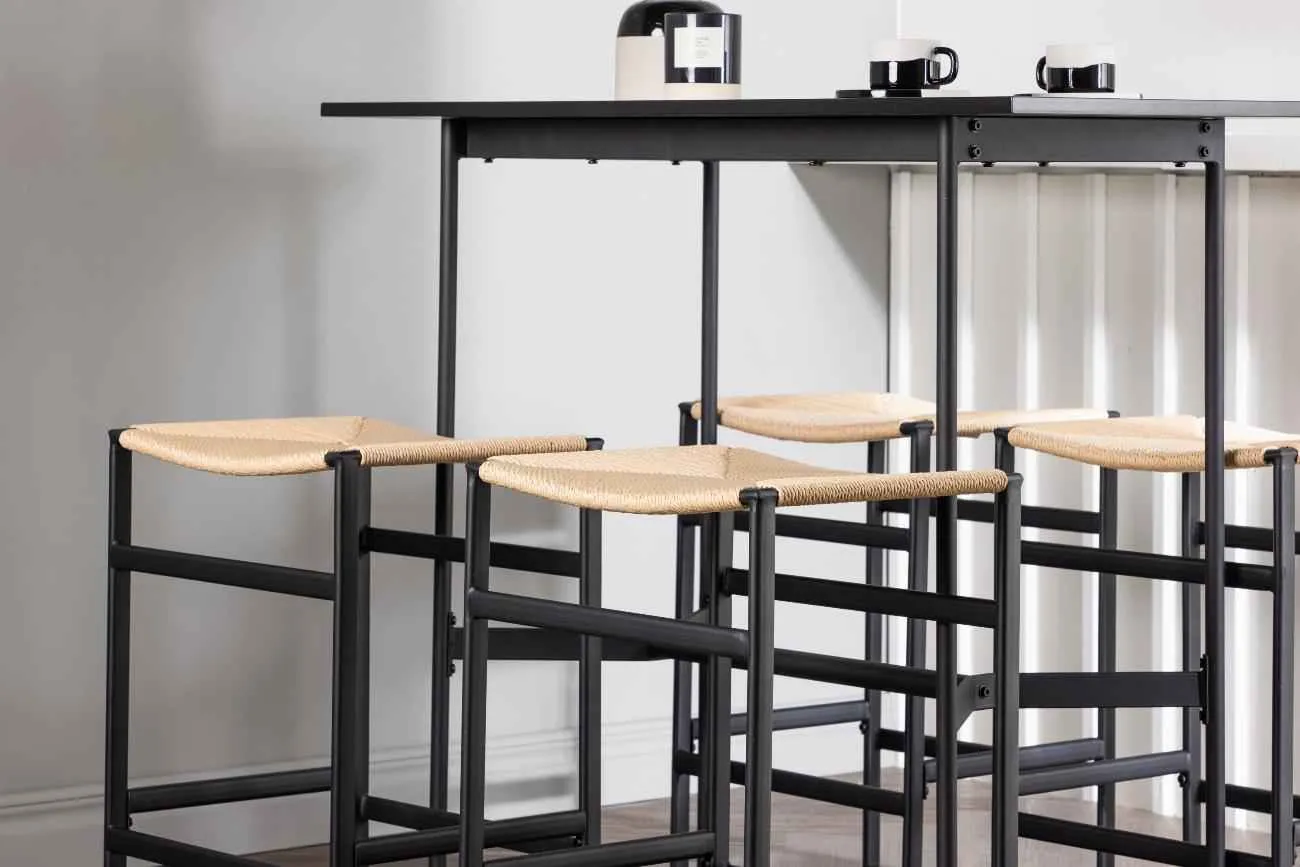 En stilren kombination av bohemisk och industriell design! Det minimalistiska barbordet Rax har en tunn bordsskiva i svart MDF och smala bordsben med integrerat fotstöd i svart metall. Här i kombination med moderna barstolar från serien Polly. Stolen har en smart kulör-kombination med sits i naturfärgat rep och raka ben med integrerat fotstöd i svart gummiträ. Vilken otrolig match! Bordets mått: 120x60cm.