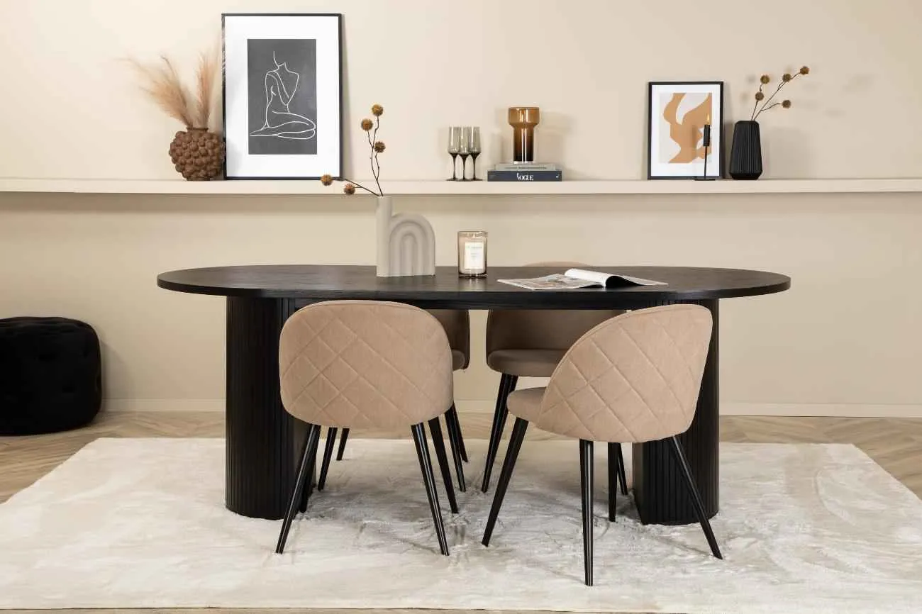 Bianca skapar ett stilsäkert blickfång som imponerar! Det här ovala matbordet i genomgående svart kulör har en modern utformning med en bordskiva i MDF och en robust stomme i ribbad design som ger ett stadigt intryck. Bordets mått: Längd: 200cm, Bredd: 90cm, Höjd: 75cm. Matchas med 4st Velvet matstolar med dekorsöm i den beige sitsen av polyester linne samt utsvängda stolsben i järn. Stolens mått: Höjd: 76,5cm, Sitthöjd: 46,5cm, Bredd: 50cm, Djup: 57cm. Stolarnas höga sittkomfort bjuder in till långa och härliga stunder för umgänge!