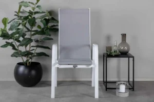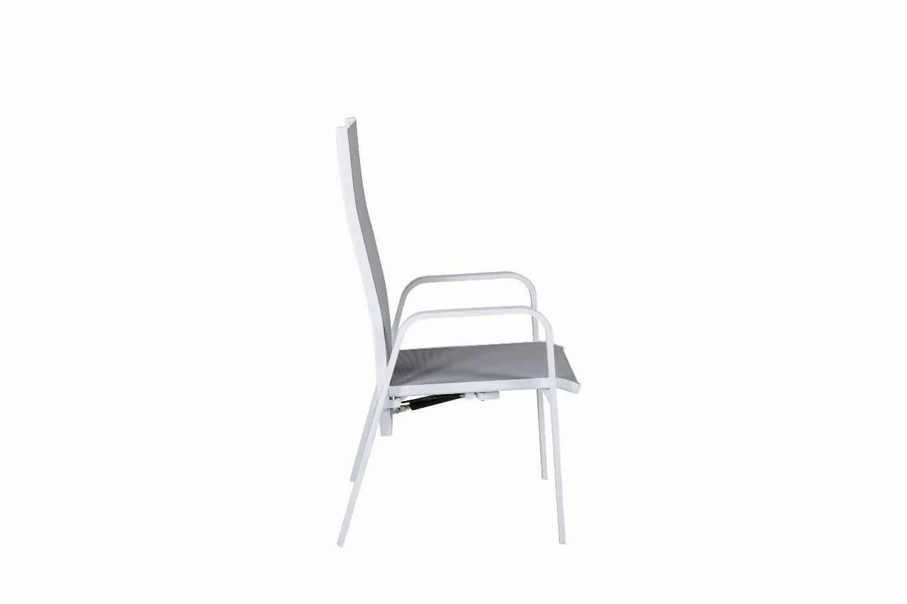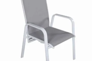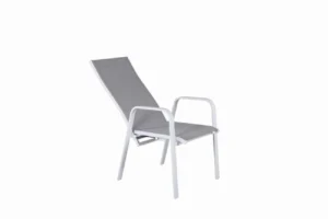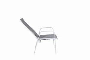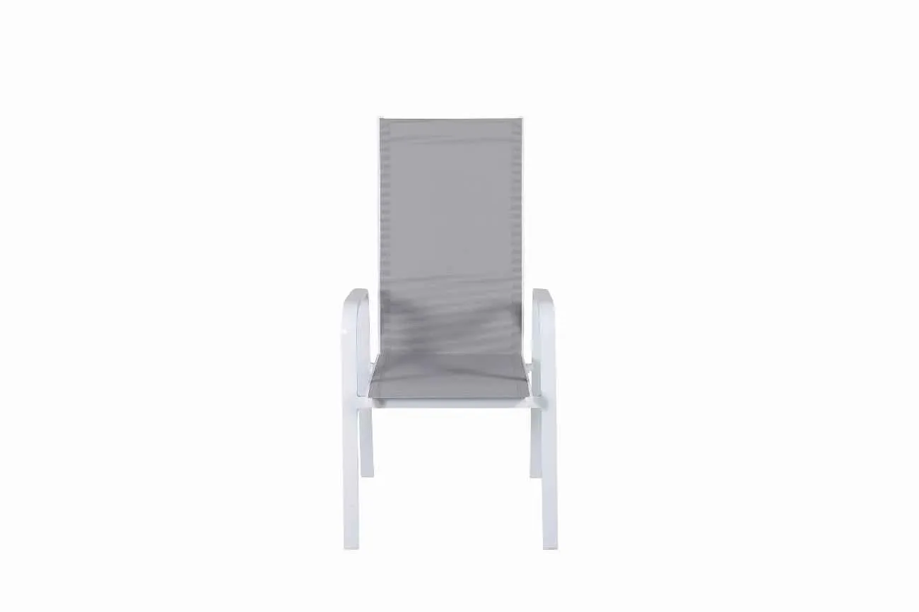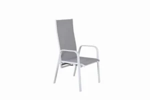 Vitgrå stapelbar karmstol från serien Copacabana som gör sig bra vid matbordet på altanen. Stolens ryggstöd går att fälla vilket gör att den är väldigt bekväm och praktisk. Njut av sommaren på allra bästa sätt!