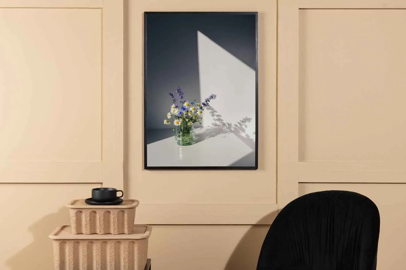 Härlig poster med motiv av ljusinsläpp som omfamnar en somrig blombukett i olika kulörer som ger en varm och somrig känsla i printet! Kombinera med andra prints för att skapa din egna touch på din vägginredning, med sina enkla kulörer går printet enkelt ihop med andra typoer av väggkonst och posters. Mått 21x30 cm.