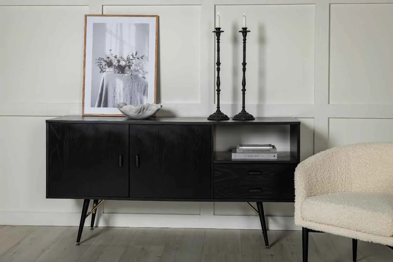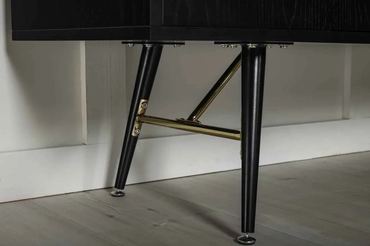 Letar du efter en elegant och rymlig byrå som inte bara är funktionell utan också ett stilfullt tillskott till ditt hem? Då är Gold byrån det perfekta valet för dig! Gold byrån är en imponerande möbel med generösa mått på 160x80 cm som erbjuder gott om utrymme för förvaring samtidigt som den sätter en elegant prägel på ditt rum. Med sin sofistikerade svarta färg och detaljer i mässing ger Gold byrån en känsla av lyx och glamour till ditt hem. De subtila mässingsdetaljerna skapar en vacker kontrast till den djupa svarta färgen och ger byrån en tidlös och elegant design. Gold byrån är tillverkad av material, inklusive MDF och Faner, och har stadiga ben i stål som ger den stabilitet och hållbarhet. Den är inte bara vacker att se på, utan den är också praktisk med gott om utrymme för att organisera dina kläder, accessoarer eller andra föremål. Du kan till och med använda den som en plats att placera dina favoritljusstakar och skapa en avslappnad och inbjudande atmosfär i ditt hem. Med Gold byrån får du inte bara en funktionell möbel, utan också en imponerande inredningsdetalj som kommer att bli en fokuspunkt i ditt rum. Skäm bort dig själv och förbättra din inredning med Gold byrån – den perfekta kombinationen av stil och praktiskt användande.