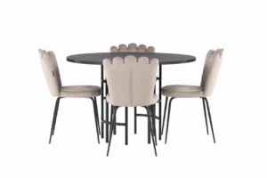 Lika charmig som bekväm! Vårt runda matbord Copenhagen har en elegant, svart bordsskiva i MDF och ett dekorativt, cylinderformat underrede i svart metall. Här i modern kombination med beige matstolar från serien Limhamn. Stolen har en inbjudande design med dekorativ snäckformad rygg med dekorsömmar och en rund sits i smakfullt beige sammetstyg. Benen är i svart pulverlackerad metall. Här vill du och dina gäster sitta kvar länge! Bordets mått: 115cm.