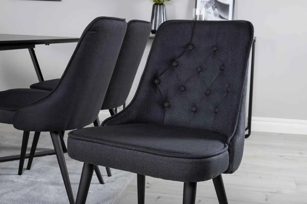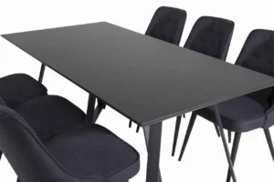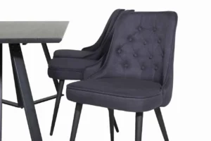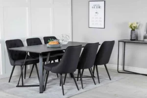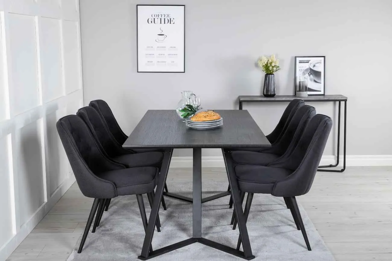 Stilrent matbord Marina med en bordsskiva i MDF och ett dekorativt underrede i metall kombineras här med matstolarna Velvet. Stolarna är robusta och väl tilltagna – här sitter du gärna kvar länge och njuter av goda vänners sällskap!